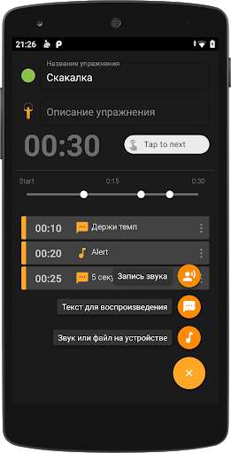 Бывает время на выполнение упражнения неопределенно (например упражнения на количество: отжимания, подтягивания). Таким образом, вы можете пометить такое упражнение опцией «tap to next», и Evotimer не перейдёт к следующему упражнению, пока вы не коснётесь экрана.