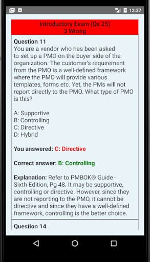 6. Каждый смоделированный экзамен должен следовать тщательному обзору и пониманию ваших слабых областей, посмотрев на объяснение неверно отвеченных вопросов со ссылкой на PMBOK® Sixthe Edition