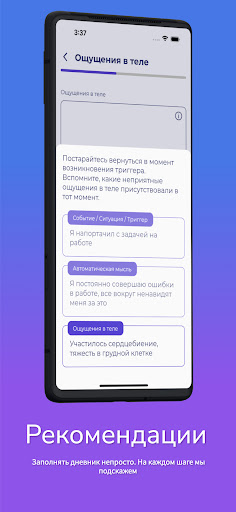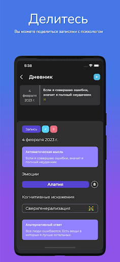 В рамках нашего приложения вы можете прорабатывать свои негативные мысли и эмоции. Наиболее эффективно работа будет проходить, если вы уже занимаетесь с психологом. Мы предоставляем удобный функционал с возможностью поделиться вашими записями со своим психологом.