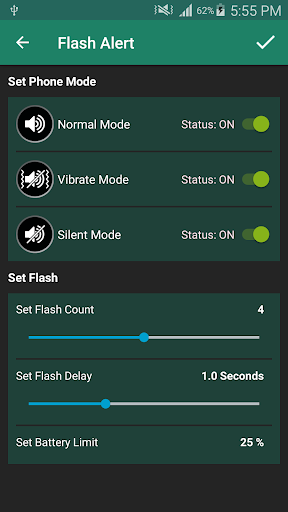 ★ Включить / отключить Flash Alert для разных режимов телефона, т.е. звонка, вибрации и без звука.