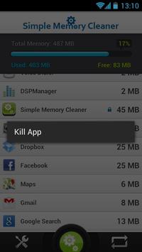 Simple Memory Cleaner features a beautiful and user-friendly interface and instantly boosts your device with just a single tap. Built using pure Android framework, it supports older devices running Android 2.2 which require more free memory to run better. Additionally, with Simple Memory Cleaner PRO you have the options to choose which apps to close, lock from cleaning, launch or uninstall and view detailed information about apps and monitor your memory usage using the built in and configurable notification and widget.