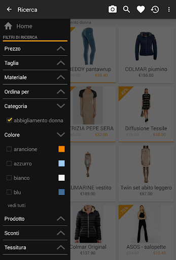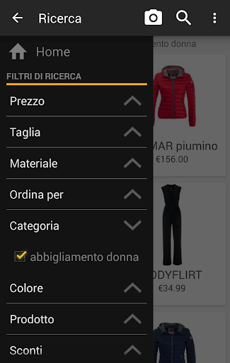 - filtra i risultati trovati per categoria, colore, taglia, materiale, tessitura e marca