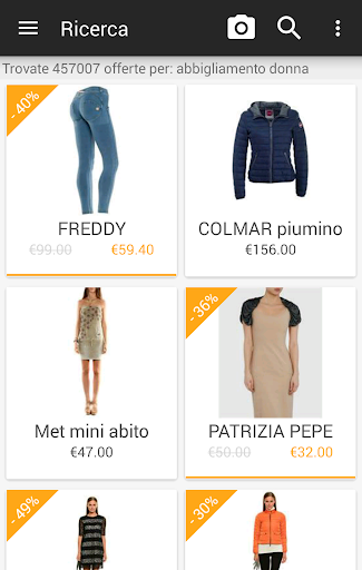 Con Drezzy puoi controllare online se il capo di abbigliamento che vedi in un negozio ha davvero il prezzo migliore! Prova la funzionalità "scatta e trova" che ti permette di scattare una foto e cercare vestiti, scarpe, cappelli simili tra le numerose offerte online a prezzi scontati.