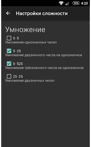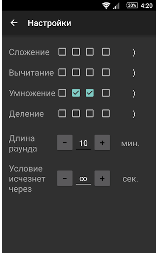 Именно то, что я искала - очень простой и функцилнальный тренажёр устного счёта. Можно настроить сложность всех вариантов примеров, длительность раундов. Можно настроить, какие примеры будут попадаться - на какие арифметические действия. Удобно!