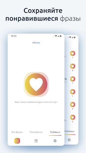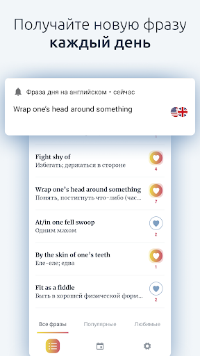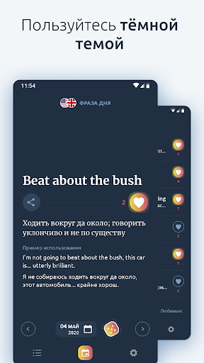 Просматривайте архив фраз за прошедшие дни. Отмечайте понравившиеся фразы, чтобы не потерять и вернуться к ним. Делитесь фразами и идиомами с друзьями в социальных сетях. Приложение оформлено в светлой и темной темах для удобства использования.