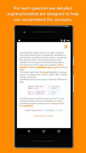 Есть ли вы опытный разработчик или новичок, вы найдете вопросы и объяснения в этом приложении, который поможет вам учиться и практиковать JavaScript, реагировать и реагировать на родных. Некоторые викторины предназначены для того, чтобы понять основы, в то время как другие нацеливаются на сложные части языка JavaScript, которые мы разработали время встречаются с временем.