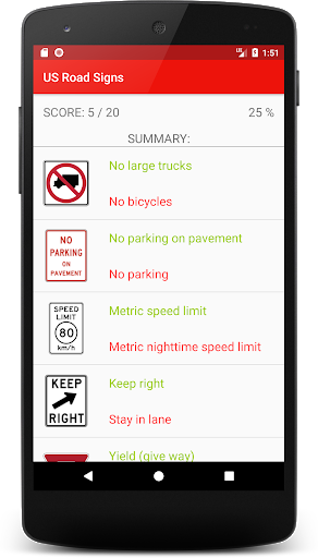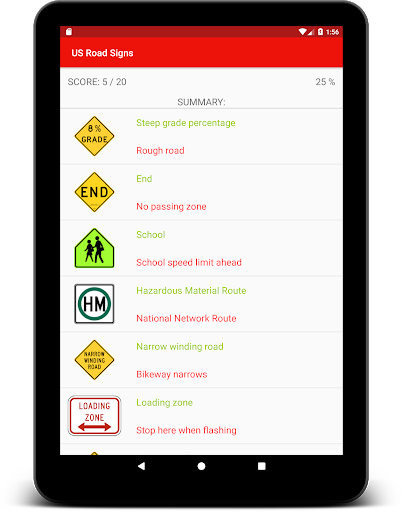 For each quiz you partake in you are given 20 questions. For each question you are presented with a sign and 4 alternative answers. There's a summary at the end of the quiz where you can see your quiz statistics, how many answers you got correct and how many you got wrong. You can also see which specific answer you gave to a question.