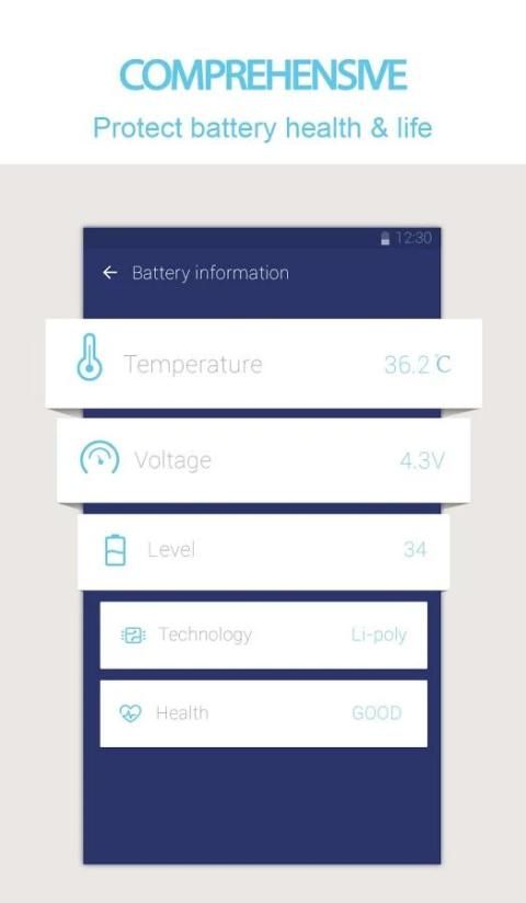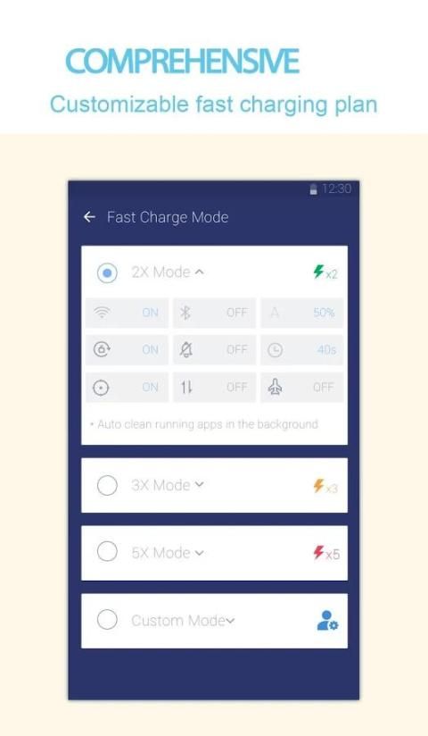 Быстрого зарядное устройство вносится база на новейшие и модернистские алгоритмах математики, скорость помощи зарядки до 160%. Кроме того, приложение предоставляет множество вариантов, чтобы включить Wi-Fi / выключить звук, фонарик, Bluetooth, яркость, GPS, мобильная связь данных, режим полета в целях экономии батареи.