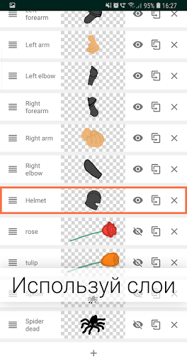 * Поддержка слоёв - используйте меню слоёв для добавления, замены, слияния и дублирования слоёв для расширенного рисования.