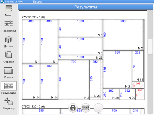 - автоматический подсчет площадей листов, деталей и обрезков, длины реза, длины кромок;