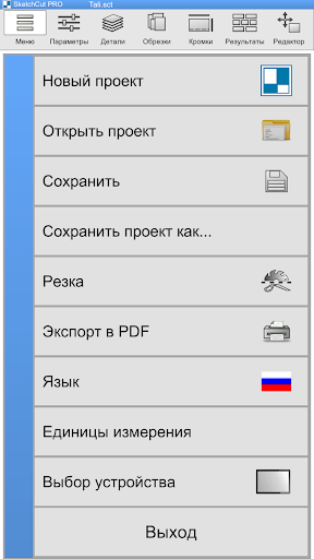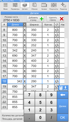 - сохранение списка деталей и параметров раскроя на Android устройстве;