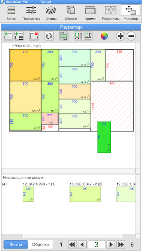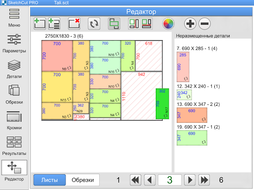 - автоматический раскрой листов и остатков в соответствии с выбранными параметрами;