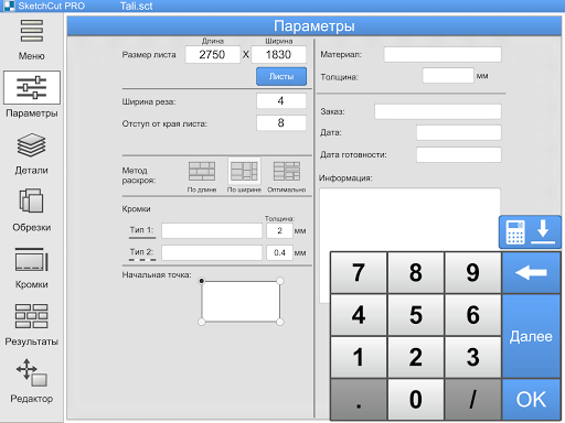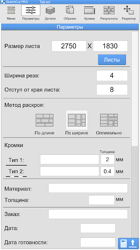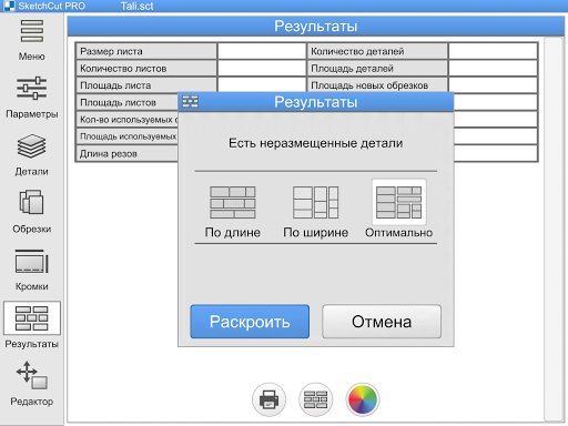 - выбор и изменение параметров раскроя (размер листа, ширина реза, отступ от края листа и т.д.);