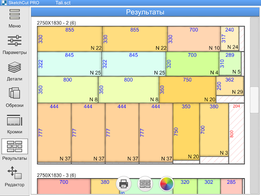 - три разных алгоритма расчета и оптимизации карт раскроя - для выбора наилучшего варианта раскроя;
