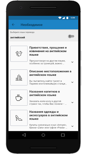 Каждый разговорник состоит из двух разделов: "Необходимое" и "Путевые фразы", где содержатся разные виды информации. В "Необходимом" Вы найдёте слова на каждый день, а "Путевые фразы" содержат список фраз для различных случаев в пути.