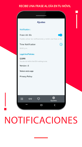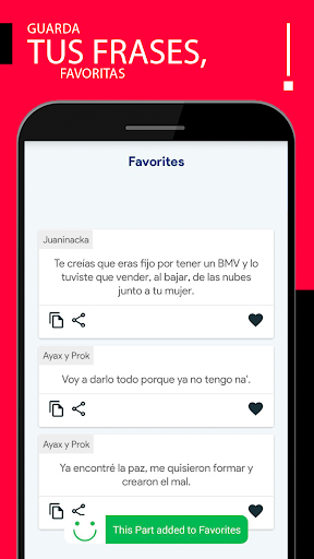 La app incluye una funcionalidad que te permite guardar tus frases de rap favoritas, además de la posibilidad de compartirlas. Además, puedes configurar las notificaciones para que cada día, a una hora, puedas recibir una frase de rap, que la aplicación te enviará automáticamente.