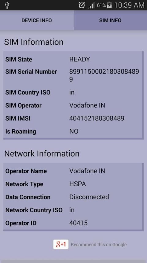 SIM Детали: Имя оператора, SIM Статус, SIM IMSI, Роуминг данных, состояния мобильных данных, Страна ISO.