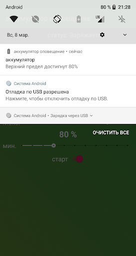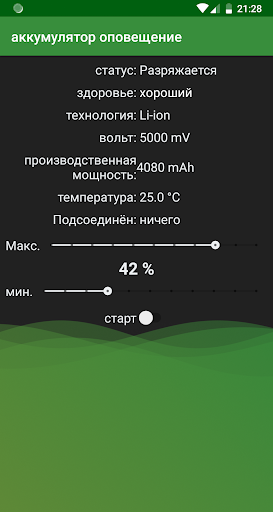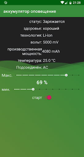 Нажмите кнопку Пуск и приложение отправит сигнал тревоги, когда процент заряда батареи достигнет желаемых значений.