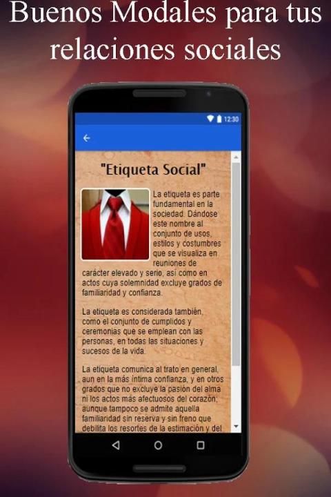 App правило социального этикета для тех, кто заинтересован в изучении немного об отношениях в высоком классовом обществе, зная, что правильные способы действия в обеденное время, представляя кого-то на вечеринке и в других ситуациях где они должны подчеркнуть нашу вежливость, элегантность и галантность в нашем контакте с другими людьми.