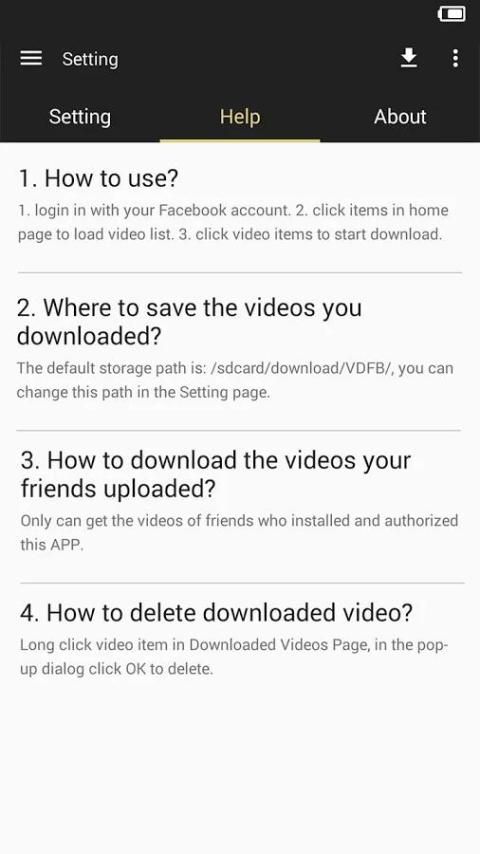 VDFB скачать Facebook видео самый лучший и самый быстрый приложения. With VDFB, вы можете скачать видео через facebook ваших групп, ваши .AND друзей, смешные, сумасшедшие, игровые видео, которые тщательно отобранные для you.Enjoy это!