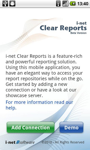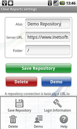 NOTE: You can test the app without your own report server using the "Demo" button. This will access a demo server, but to make full use of this app together with your own i-net Clear Reports server, an i-net Clear Reports PLUS license is required. The report repository feature is only available with this license. On our web site you can get a free trial version of i-net Clear Reports PLUS.