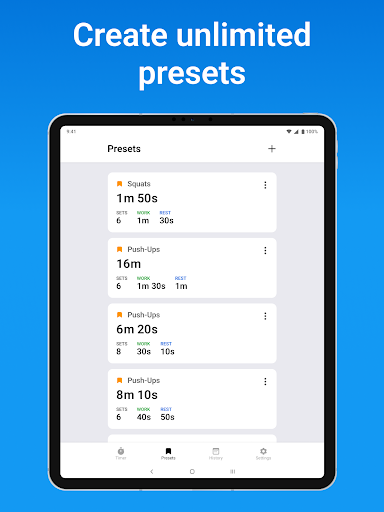 Save your workouts in the presets section. It's also possible to create your own custom intervals. You can add an unlimited number of presets.