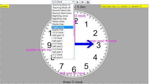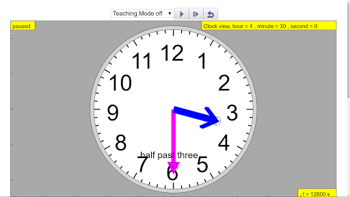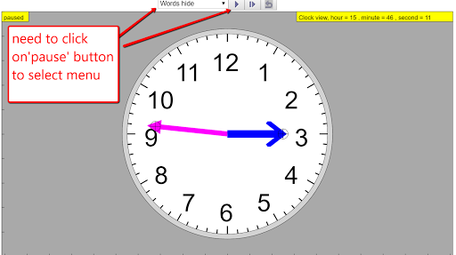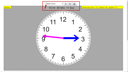 The teaching simulation starts running immediately showing the real world time. The seconds (RED) hand is hidden by default to make the view simple. The view is simple with just the hour ( BLUE) and minute (MAGENTA or easier to call it PINK?) hands. The interactive elements are shown as cross-hair circles on the hour, minute and second hands that automatically compute the respective positions.