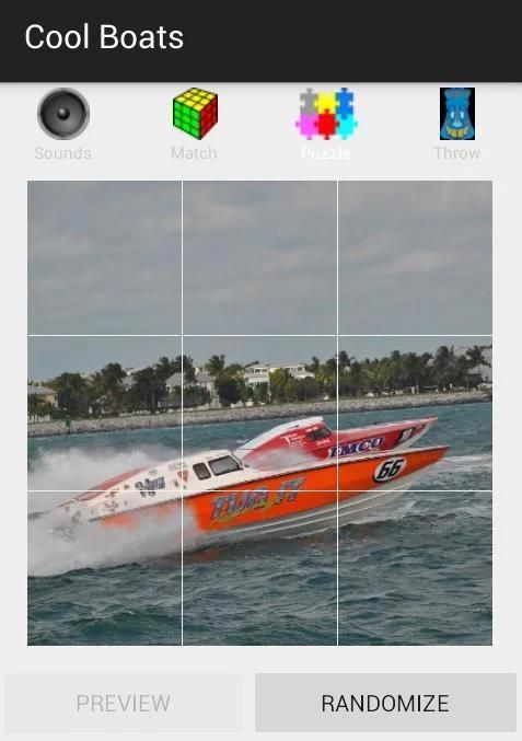 2. Пусть нажать на кнопку "Randomize", сдвиньте несколько частей, а затем нажмите на кнопку назад. Это простой способ познакомить их с помощью приложения, развивать мелкую моторику, и это очень интересно для них, чтобы увидеть гоночные лодки головоломки карабкаться.
