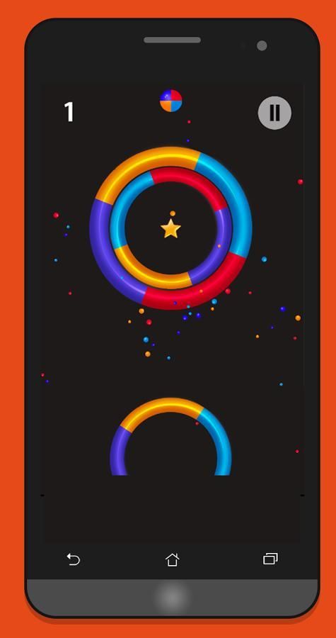 Мяч переключает цвет после прохождения каждого препятствия. Попадают в неправильный цвет и игра закончена.