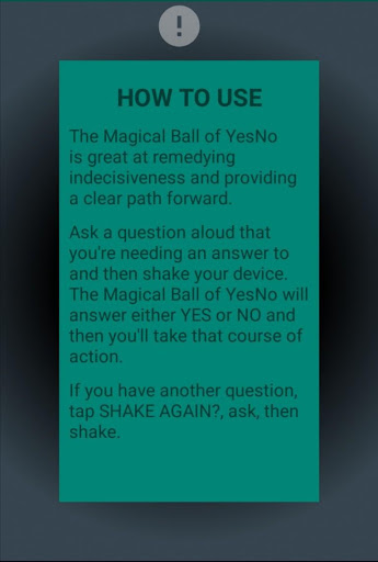 Задайте вопрос вслух, вам нужно ответить, а затем встряхните свое устройство.Волшебный шар Ysno ответит либо да, либо нет, и тогда вы возьмете этот курс действий.