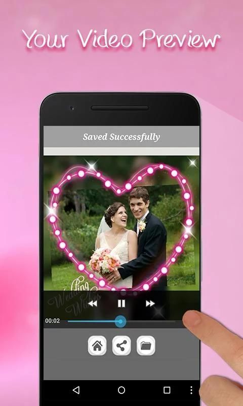 Хотите, чтобы конвертировать ваши свадебные фотографии в видео? Это видео производитель поможет вам создавать удивительные темы свадьбы видео, используя ваши свадебные фотографии. Это приложение специально сделано, чтобы создать свадебную тему видео с помощью фотографий. Он преобразует фотографии в видео слайд-шоу с большим количеством эффектов настройки, как свадьба кадров, смешать мини-анимационные ролики, песни с днем рождения и музыки, текстовый редактор и многое другое.