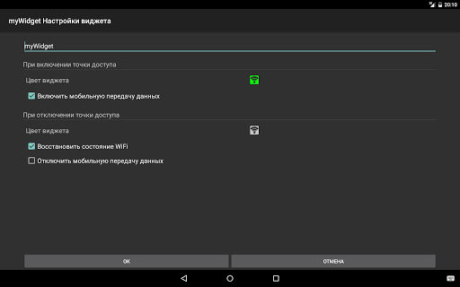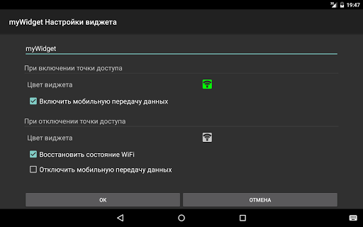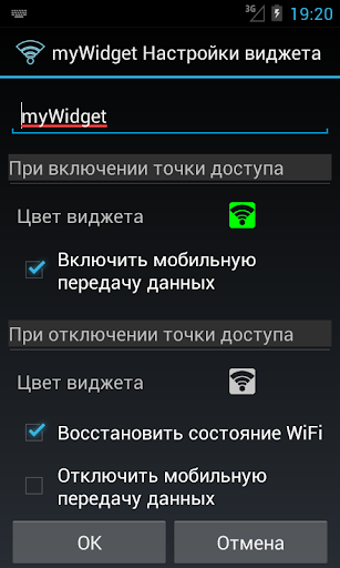 Виджет позволяет одним касанием превратить телефон в переносную точку доступа WiFi (WiFi Tether) и раздавать интернет на все ваши устройства.