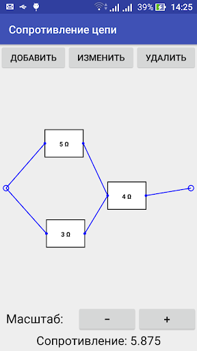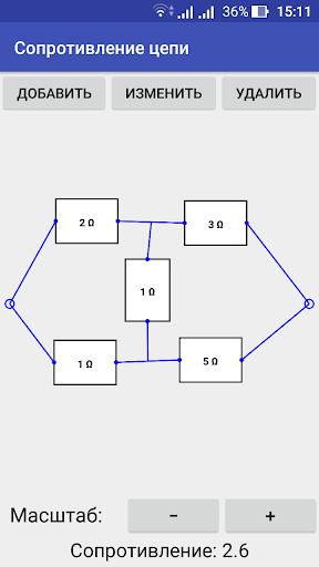 Приложение поможет вычислить сопротивление цепи. Чтобы убрать провод, просто проведите его ещё раз. Чтобы повернуть резистор, нажмите на него.