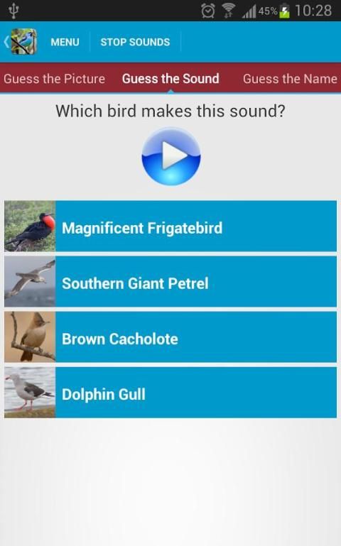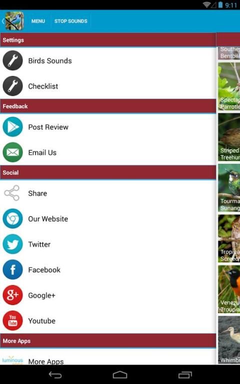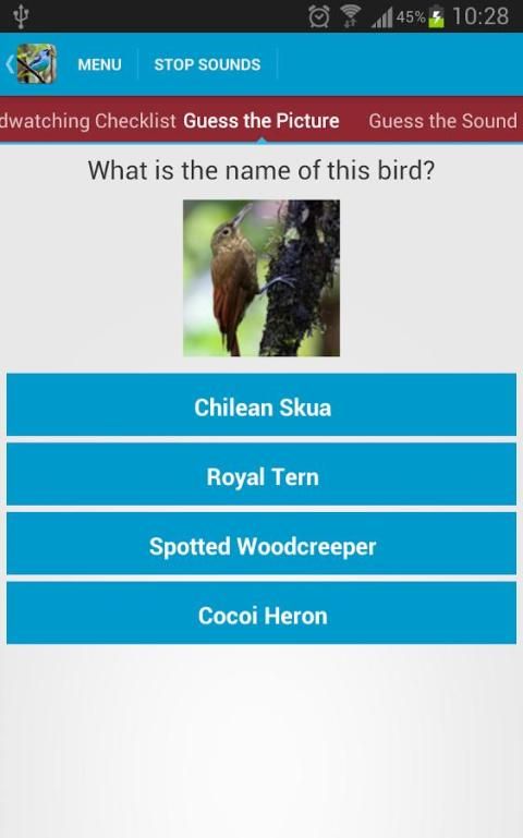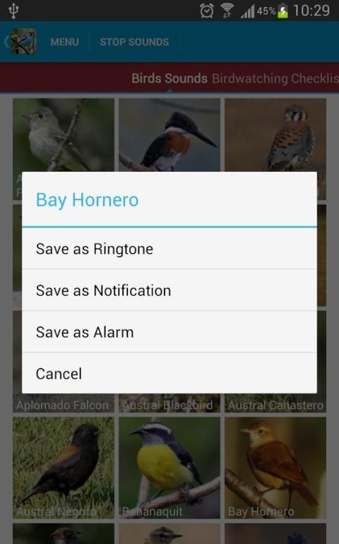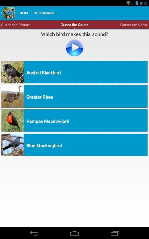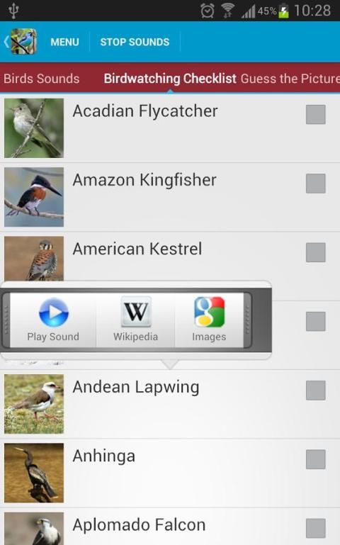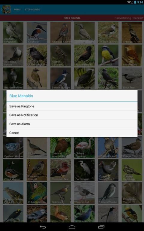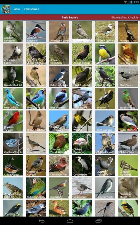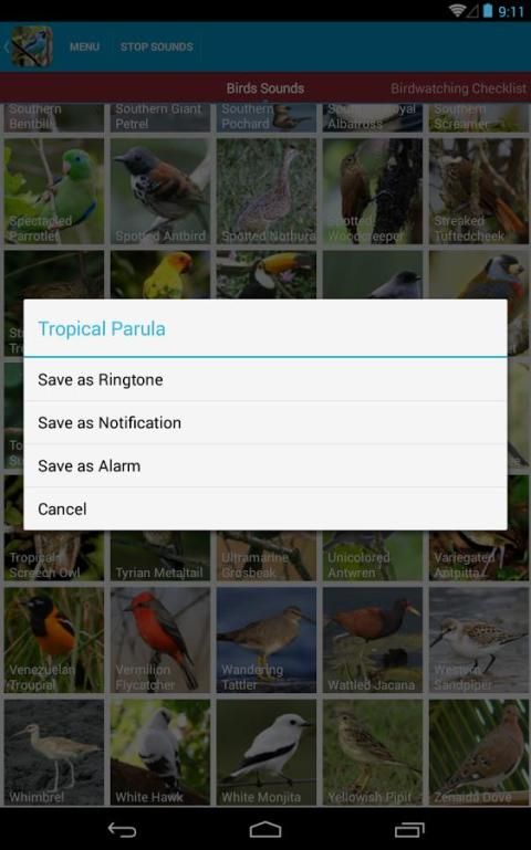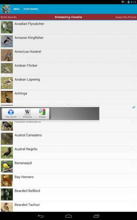 Presenting a completely Free South American Birds Sounds compilation app with high quality sounds and songs of birds found in South America! Featuring the Amazon Kingfisher, Andean Flicker, Bananaquit, Blue Dacnis, Bobolink, Golden Parakeet, Green Aracari, Marbled Godwit, Mottled Owl, Pampas Meadowlark, Pied Puffbird, Plovercrest, Purple Gallinule, Riverbank Warbler, Spectacled Parrotlet, Toco Toucan, Tropical Screech Owl, Vermilion Flycatcher, White Hawk, White Monjita and many more birds! Bird Sounds can be played by tapping on a bird picture. All sounds can be saved as Ringtones, Notifications and Alarms by long pressing on a bird and selecting the relevant option. A Birdwatching checklist is included allowing you to tick off birds you have seen. Tapping on a bird on the checklist screen allows you to view more information about the bird on Wikipedia or perform an image search via Google images. Mini games are also included helping you to learn the different birds found in this app: Guess the Picture, Guess the Sound and Guess the Name. In App Billing is supported via the 'Remove Ads' button. Upon purchasing this upgrade this app will no longer serve any adverts. Permissions are required for saving birds sounds. All images and sounds used are royalty free. If you have any questions, requests or suggestions, just send an Email or Tweet us and we'll happily respond :)