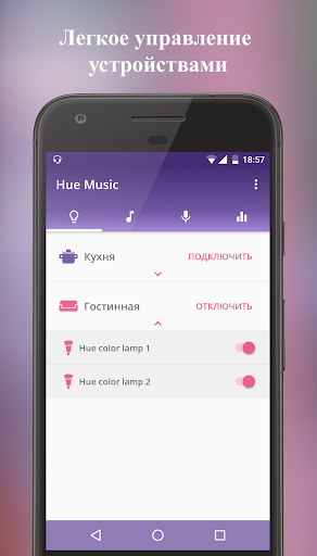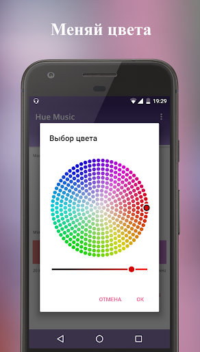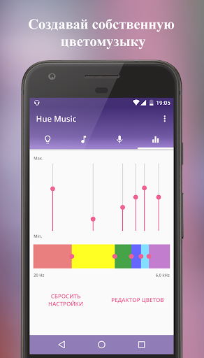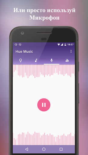 С помощью приложения Вы получаете качественную цветомузыку для праздника, вечеринки, релакса или для вдохновения. Главная фишка Hue Music - это возможность использования исходных аудио-файлов без шумов, которые возникают при использовании микрофона телефона. Приложение преобразует частоту и амплитуду звука в цвета каждый момент времени.