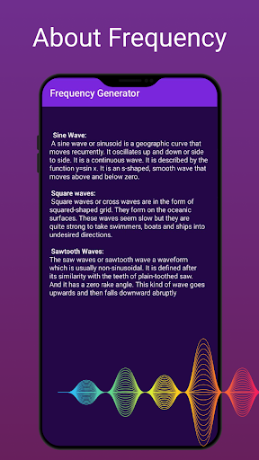 Частотный генератор представляет собой бесплатный дурак Android, который используется для генерации волны синуса, квадратной волны или треугольной волны. Генератор частоты / Waves Generator - лучшее приложение для генерации различных форм волн, таких как синусоидальные волны, квадратные волны и пиловые волны. Вы можете воспользоваться этим приложением и его художественному использованию, создавая волны с их колеблющими частотами, которые варьируются от 990,00 Гц до 1010,00 Гц. Вы также можете найти уровень различных форм сигналов с помощью частотной цепи / генератора частоты / стимулятор функций / волн производитель / частоты генератора волн довольно легко и без особых усилий. Это приложение работает на вашем устройстве Android и функционирует как электронное устройство, которое создает частоту волн для художественного использования.