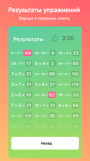 - Различные виды тренировок, каждый из которых состоит из групп арифметических задач;
