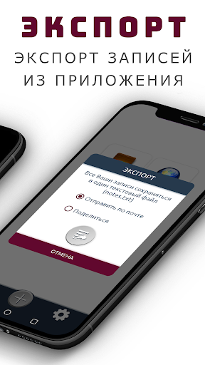 Все заметки можно в любое время экспортировать/скопировать себе на устройство или отправить одним текстовым файлом по почте или в другое приложение. Поэтому в случае потери телефона или сбоя в устройстве Ваши записи сохранятся.