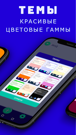 В блокноте представлены несколько красивых цветовых тем на любой вкус. Вы можете выбрать строгую белую тему, классическую или супер яркую под Ваше настроение. Менять их можно хоть каждый день.