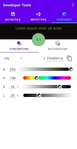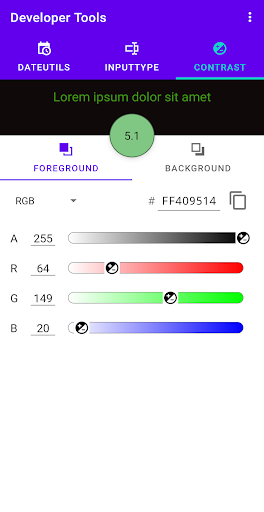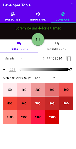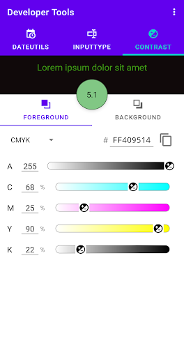 Вы можете ввести свой цвет в Hex, RGB, CMYK, HSL, HSV или выбрать один из цветов материала Android.