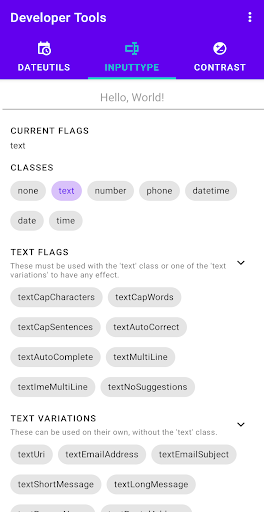 Edittext имеет 32 (YUP , 32) различные входные вещества, доступные для использования. Хотя каждый будет по существу, имеет одинаковую функциональность на всех клавиатурах, каждая клавиатура может по-разному реагировать на InportType. Некоторые отображаются дополнительные ключи, некоторые нет. Теперь вы можете посмотреть, как каждый inputtepe (и комбинация inputtypes) влияет на вашу активную клавиатуру.