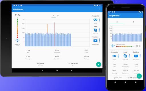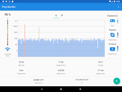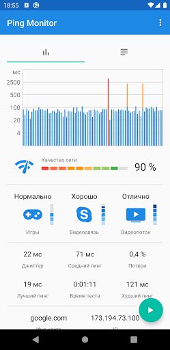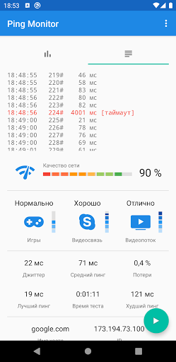Pingmon (Ping test monitor) - это графический инструмент для замера и мониторинга качества интернета или локальной сети, Wi-Fi и 3G/LTE.