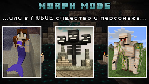 Morph into Mobs - это приложение с модами для MCPE (BE), которое позволит вам получить новую способность превращаться в любого моба в Майнкрафте. Сделать это довольно просто - после установки понравившегося аддона выберите нужного моба в меню морфинга в Minecraft. После этого вы превратитесь в выбранное существо со всеми его способностями и статами. С нашим приложением вы сможете превращаться в варденов, эндерменов, существ-мутантов, виттеров, големов, дракона края, русалок и многих других! Разве не этого вы хотели - перевоплотиться в любого моба в Minecraft и понять, каково это - побывать в шкуре самого необычного существа или персонажа? Если вам надоела обычная версия игры и хочется разнообразить игровой процесс, то этот майнкрафт морф моды именно для вас. В нашей подборке вы найдете множество аддонов на трансформацию.