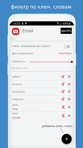Позволяет настраивать звук уведомления для приложений, у которых практически нет настроек уведомлений. Возможность выбора определенного звука для каждого ключевого слова.