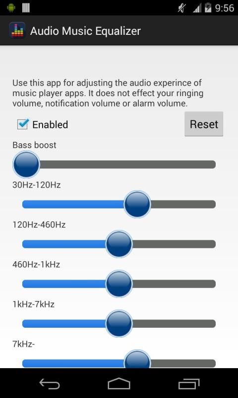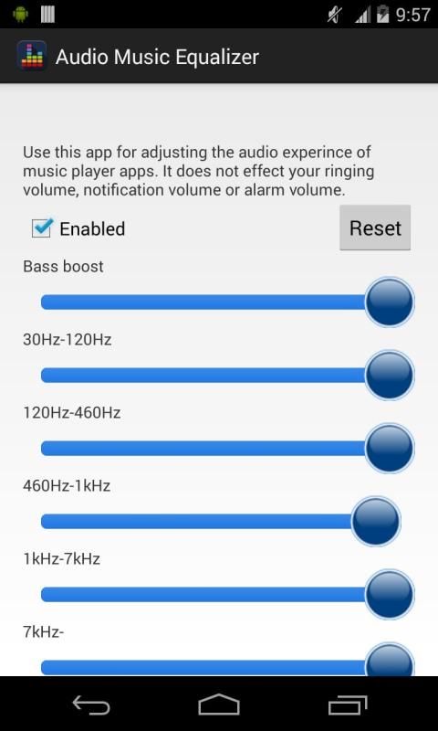 Equalizer lets you adjust sound effect levels so that you get the best out of your Music or Audio coming out of your phone. Music Volume Equalizer will make your music sounds like you've never had before. Improve sound quality on your phone and get live audio readings of your current music volume level. Let their songs much better with the Music Equalizer! Improve your phone or tablet's sound quality now! Features: * Media volume control * Five band equalizer * Bass boost effect * Virtualizer effect * 9 equalizer presets * Save custom presets * 3D Surround Sound * Many equalizers preset * Can turn off and turn on equalizer effect This application uses the functions of audio effects that are standard with the Android OS. Depending on the version of OS events up its own specifications and terminal, audio effects no longer work has occurred. The best music equalizer on the Google Play! We love creating apps, and want to keep them free forever. In order to keep our development running, Equalizer is ad-supported to generate some revenue. When you click on advertisements delivered by this application, you will typically be directed to a third-party’s web page. Ads Disclaimer: This app is also supported by ads via Banners and Dialog Interstitial ads, Some users will also receive full screen ads, and ads on home screen via push ads and icon drops. This app contains ads from airpush and notifymob.