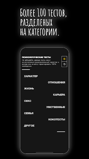 Есть свободная минутка? Загляните в приложение, и узнайте лучшие стороны вашего характера, в порядке ли ваши нервы, или же больше о ваших отношениях с противоположным полом. Вашему вниманию представлено более 100 психологических тестов разделенных по 9 категориям, и вот самые интересные из них:
