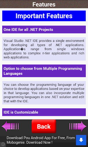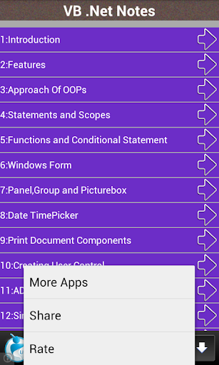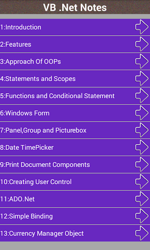 Обучение VB .NET - это пошаговое руководство / учебник на VB .NET, он направлен на тех, кто начинает или только начал изучать VB .NET. Узнайте VB .NET В самые быстрые возможное время с этим кратким приложением, которое учит вас всех основных существ о VB .NET. Это приложение полезно для всех BCA, B.SC Comp. SCI., MCA, M.SC и студент ITI. Это приложение охватывает программу этих филиалов.