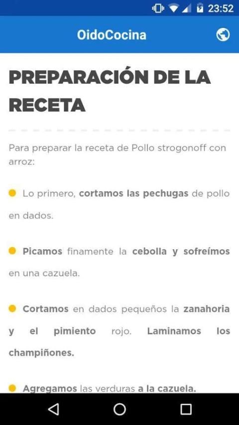 Вы когда-нибудь случилось, вы не знали, что делать с тем, что у вас есть в холодильнике, потому что он имеет Забудьте вы покупаете или не чувствуете, как приготовление пищи?. OidoCocina это приложение; просто скажите ингредиенты доступны покажет список возможных рецептов.
