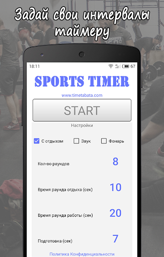 с гибкими настройками, удобным и простым интерфейсом. На экране всегда виден счёт таймера. Громкий свисток не даст Вам пропустить старт. Есть возможность задавать своё количество и продолжительность раундов.
