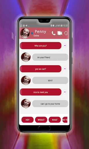 Добро пожаловать в страшный клоун для поддельного чата и видео и видео. Чат с игрушкой Pennewise - приложение для отдыха для симуляции разговоров в чате. Смеяться со своими приятелями, заставляя их согласиться с тем, что вы честно разговариваете с обоими пенни.